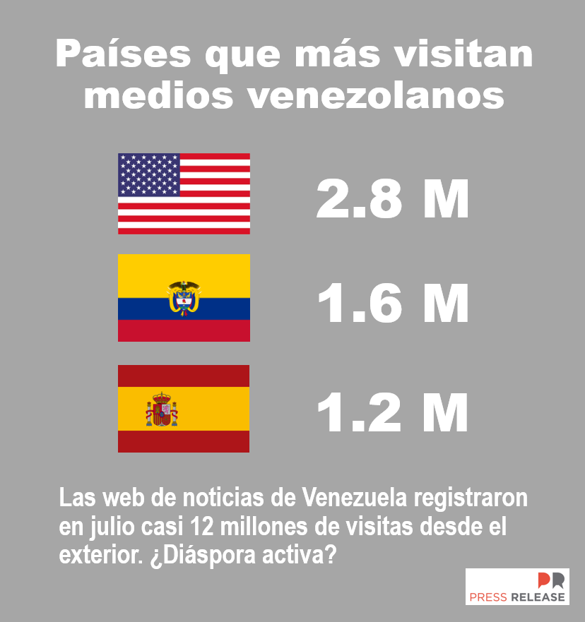 Del total de visitas registradas en julio a los medios informativos web de Venezuela, 22,9 % provienen de afuera. De ellos, la mayor cantidad se genera desde los Estados Unidos, con 2.8 millones de visitas, seguido por Colombia con 1.6 millones y España, con 1.2 millones.